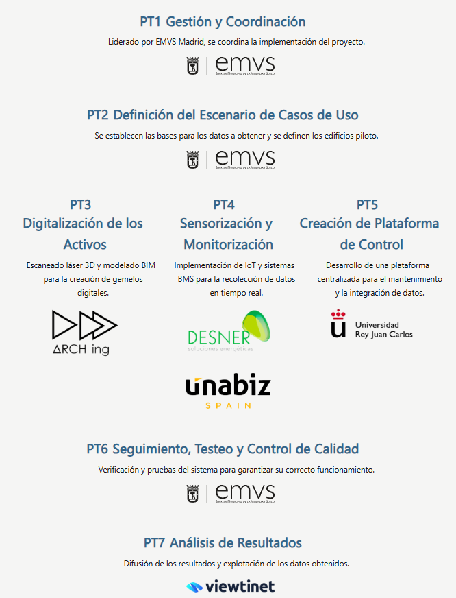 EMVS Madrid es una empresa con más de 40 años de trayectoria en el desarrollo de vivienda social en Madrid. Su función dentro del proyecto será la de empresa tractora y coordinadora de los paquetes de trabajo transversales (PT1, PT2 y PT6), que incluyen gestión y coordinación, instalación de sistemas de control en edificios piloto y supervisión del proyecto. También impulsará estrategias de innovación, sostenibilidad y optimización de recursos en la construcción y rehabilitación de viviendas.
